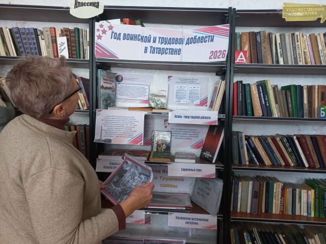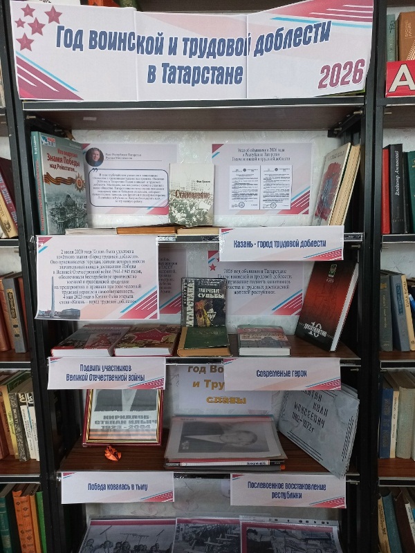 Книжная выставка «Год воинской и трудовой доблести». Выставка посвящена Году воинской и трудовой доблести Республики Татарстан. Это не просто экспозиция, а дань уважения и глубокой признательности тем, кто своим мужеством, самоотверженностью и неустанным трудом ковал победу и строил мирное будущее страны. В этом году особенно чтим подвиги земляков, которые в годы Великой Отечественной войны сражались на фронтах, проявляя невероятную стойкость и героизм. На выставке можно познакомиться с историями жизни и боевыми путями отважных воинов, узнать о их подвигах, которые навсегда останутся в памяти поколений. Но не менее важна и трудовая доблесть тех, кто в тылу, не покладая рук, трудился ради общей победы. Выставка также посвящена самоотверженному труду жителей Татарстана в годы войны и в послевоенное время. Читатели вспомнят, как люди, несмотря на все трудности, восстанавливали разрушенное хозяйство, обеспечивали фронт всем необходимым, строили новые заводы и фабрики. Это истории о силе духа, стойкости и безграничной любви к Родине.