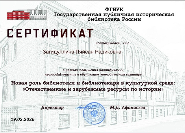Сертификат о повышении квалификации выдан библиотекарю Тумутукской сельской библиотеки.
