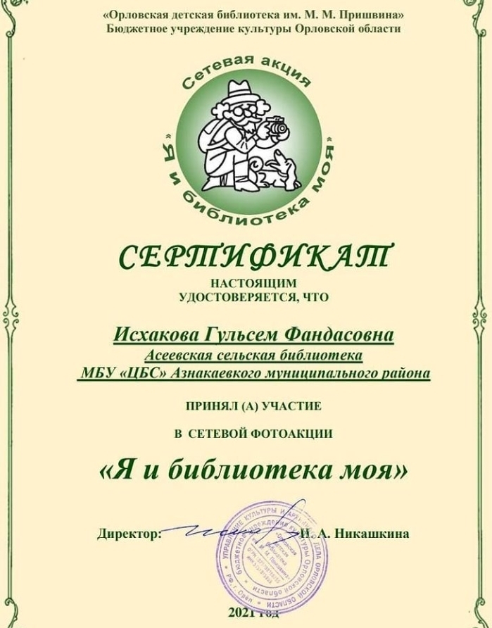 Сертификат вручается библиотекарю Асеевской сельской библиотеки за участие в сетевой фотоакции "Я и библиотека моя".