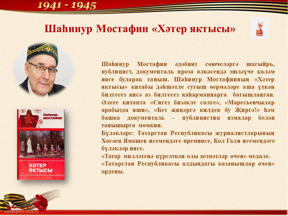 Шаһинур Мостафин сугыш кырларында ятып калган батырларны эзләү, аларның якты истәлекләрен киләчәк буыннарга җиткерү юнәлешендә нәтиҗәле эшләүче эзтабар язучы. Шаһинур Мостафин «Хәтер яктысы» китабында туган илебезгә сигез каһарманны бүләк иткән легендар Ана Фатыйма Әхмәдиева турында укырга мөмкин. Матросов батырлыгын кабатлаган каһарман якташларыбызның үлемсез батырлыгы белән танышырга һәм башка кызыклы шәхесләрнең кылган батырлыклары шулай ук аларның шәхси архивларыннан булган фоторәсемнәрне карый аласыз.