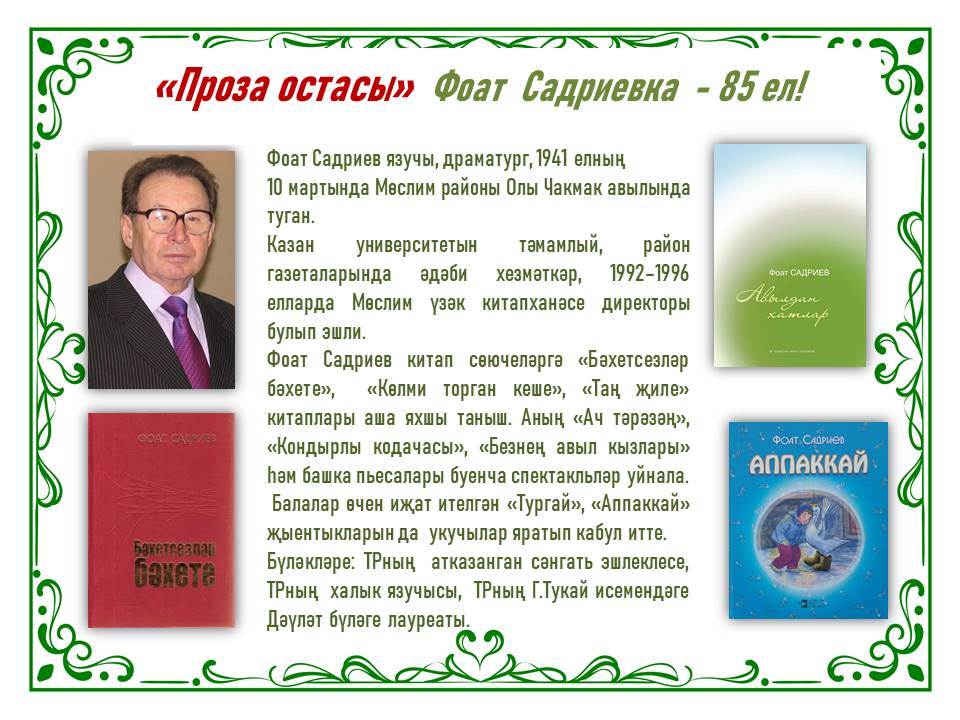 Балалар китапханәсе – 3 нче филиал Фоат Садриевның тууына 85 ел тулу уңаеннан укучыларны әдипнең иҗаты белән таныштыра.
