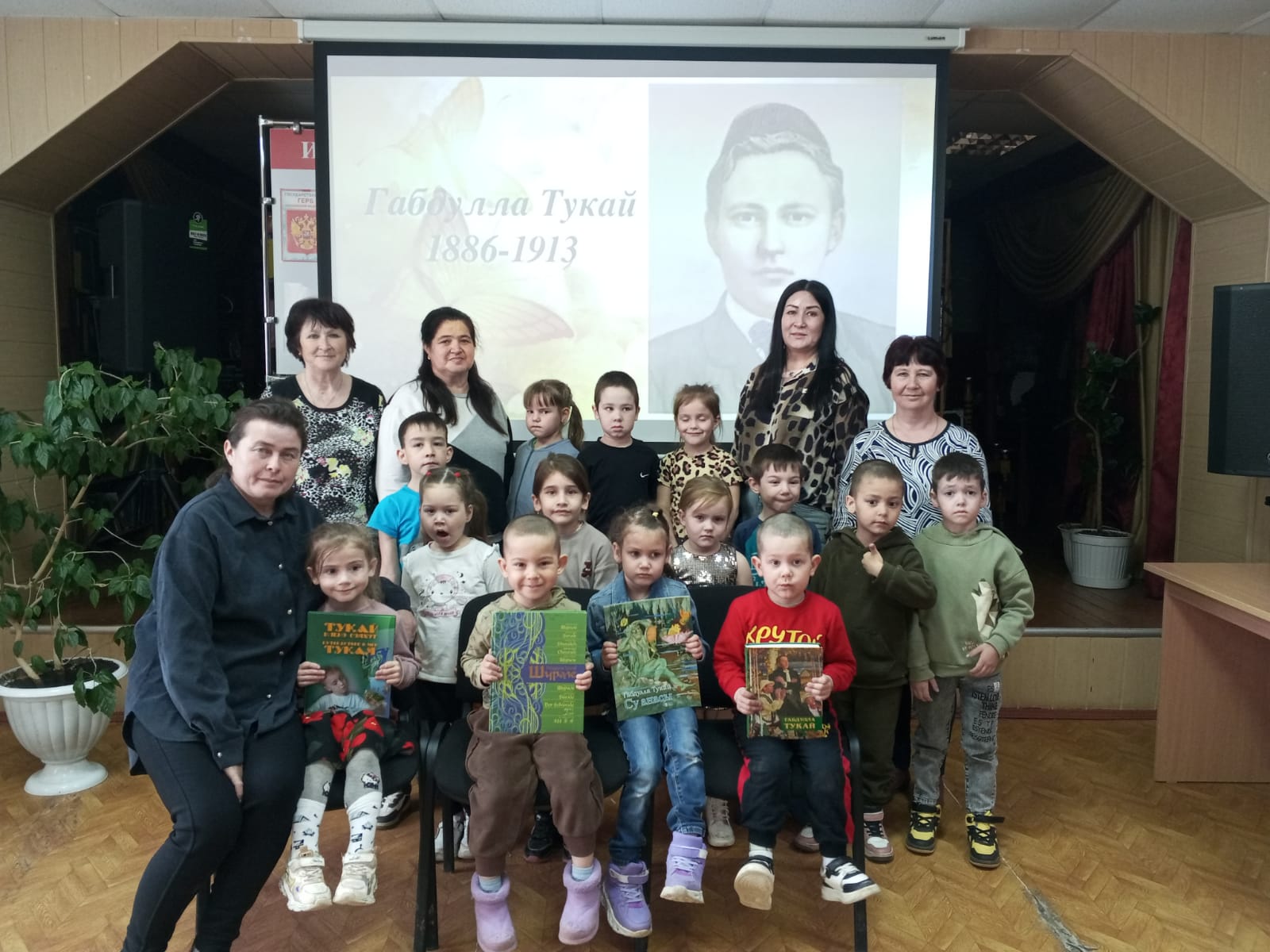 Китапханәдә 25 нче апрель көнне “Тукай безнең йөрәкләрдә “ диеп аталган әдәби-музыкаль сәгать узды. Чарага "Кояшкай" балалар бакчасында тәрбияләнүчеләр кунак булып килде . Китапханәче балаларга шагыйрьнең авыр балачагы, тормышы һәм иҗаты турында сөйләде. Аның биографиясеннән тыш, татар халкының бөек улы турындагы замандашларының истәлекләрен тыңладылар. "Иллюстрация буенча Тукай әсәрен бел» дигән кечкенә викторина укучыларга бик ошады. Балалар бөек татар шагыйренең шигырьләрен сөйләделәр. Чара татар халкының гимнына әверелгән «Туган тел» җыры белән тәмамланды.