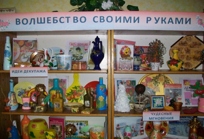 “Булган куллар” иҗади клубы сәйлән белән чигү, бәйләү, декупаж, чигү, топинарий техникалары буенча ясалган эшләр күргәзмәсе куйды.