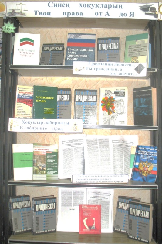 Китапханәнең уку залында хокук бозу профилактикасына багышланган “Синең хокукларың” еллык күргәзмә эшләүне дәвам иттерә. Анда хокуклар турында белем алырга мөмкинлек биргән әдәбият күрсәтелгән, бу яшүсмер-укучыларга хокукларын аңларга ярдәм итәчәк.