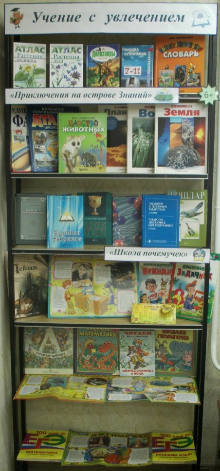 Экспозициядә балаларга мәктәптә үтә торган предметлар буенча белем өстәргә ярдәм иткән фәнни-популяр әдәбият, төсле атласлар hәм энциклопедияләр күрсәтелгән.